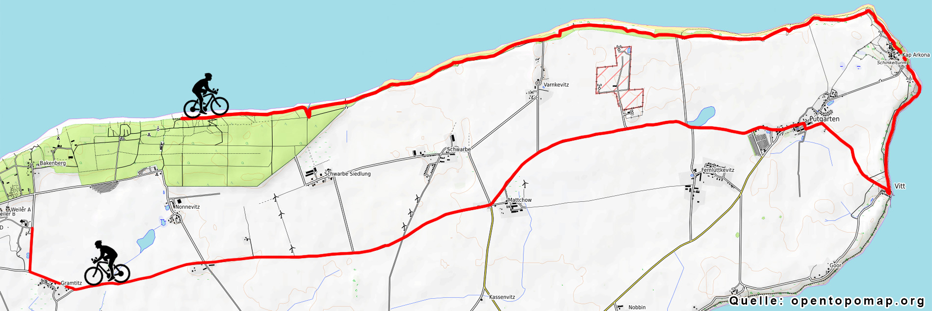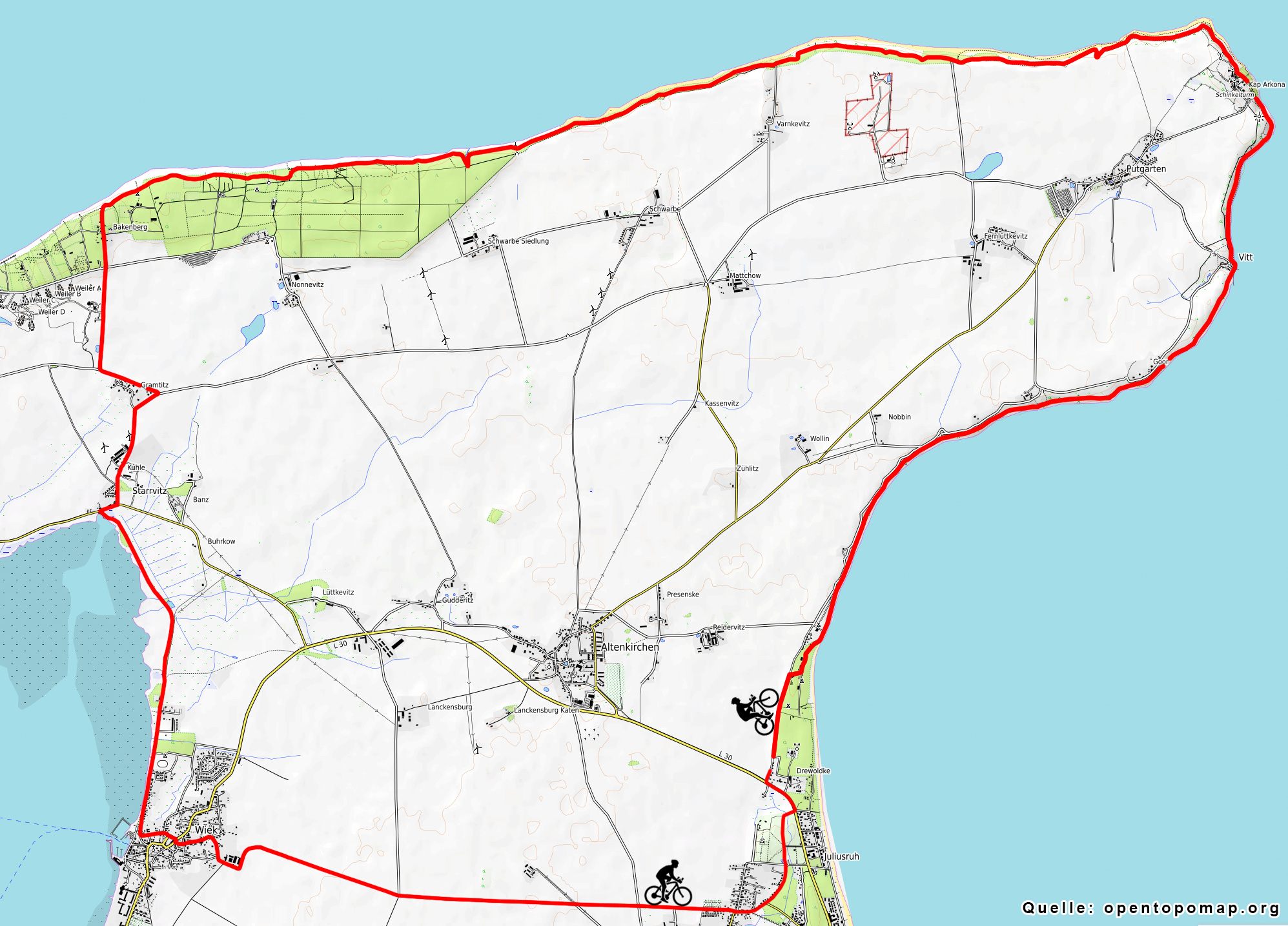 Start in Drewoldke bei Altenkirchen. Immer Richtung Arkona und Vitt. Von Vitt weiter Nach Kap Arkona und dann den Küstenradweg Richtung Bakenberg / Feriendorf nehmen, über Lancken und Starrvitz entlang zum Bodden. Immer am Boddenentlang nach Wiek fahren und dort links abbiegen Richtung Breege/Juliusruh. In Juliusruh wieder nach Drewoldke zum Startpunkt.