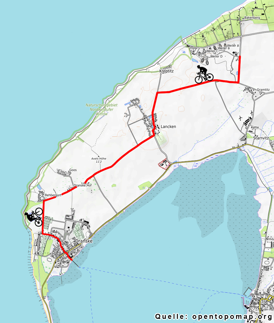Start am Feriendorf rechts weg und dann wieder rechts Richtung Lancken, durch Lancken fahren Richtung Dranske Hof und weiter nach Dranske. Sie fahren vorbei an Feldern und in Meernähe. In Dranske sehen Sie die Insel Hiddensee und zur Boddenseite ist das Strandhotel Dranske und die Surf- Segelschule "Rügen Piraten". Die westlichste Landzunge, den "Bug" können Sie nur als geführte Wanderung besuchen, es ist Sperrgebiet, hier war früher ein militärischer Stützpunkt der NVA. Die Rückfahrt verläuft ebenso wie der Hinweg.