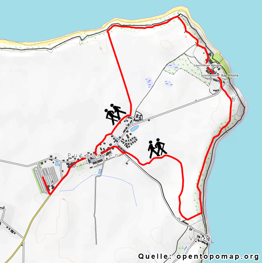 Die Wanderung beginnt am Parkplatz in Putgarten und geht Richtung Kap Arkona. Am Ausgang von Putgarten gehts jedoch zunächst rechts ab Richtung Fischerdorf Vitt. Von Vitt aus gehts über den Hochuferweg nach Arkona. Bitte gehen Sie nicht runter zum Strand bei Arkona (Abbruchgefahr!). Dann führt der Weg durch das Naturschutzgebiet Nordufer und hohe Dielen. Dann geht es links ab zurück nach Putgarten.