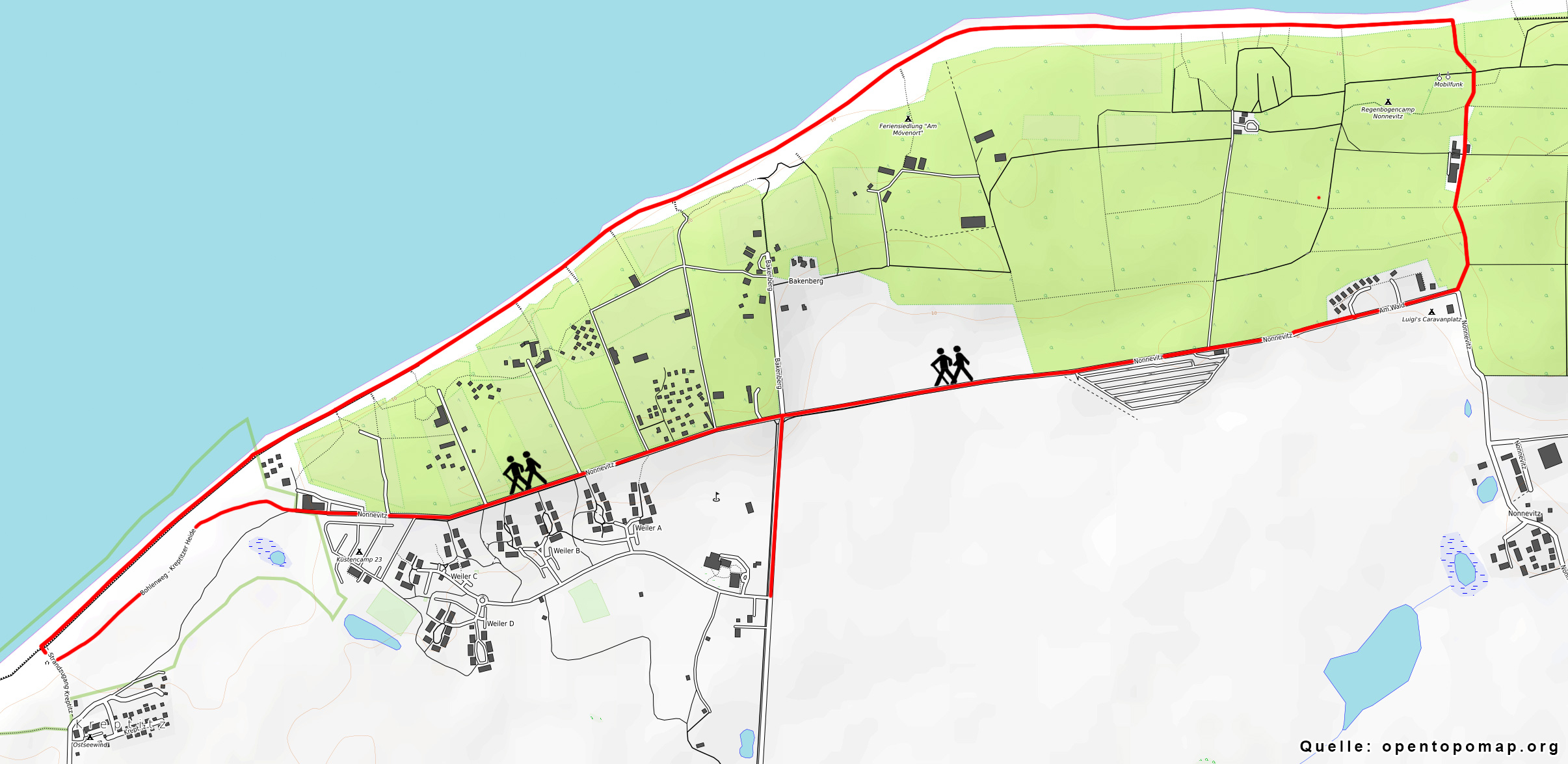 Start am Feriendorf links Richtung Meer / Kreptitzer Heide. Durch das Gatter gehen den Weg entlang durch die Heide immer Richtung Dranske / Meer. Vorne gehen Sie wieder durch ein Gatter (Zaun heideschaafe), und rechts die Treppe runter zum Strand. Nun nach rechts zurück am Strand ca. 2km gehen bis zum Aufgang Regenbogencamp (DLRG Rettungsturm, NIVEA). Über den Campingplatz den Hohlweg zurück zum großen Parkplatz, von da rechts die Strasse zurück bis zum Feriendorf gehen. Es geht entlang des Feldes zurück.